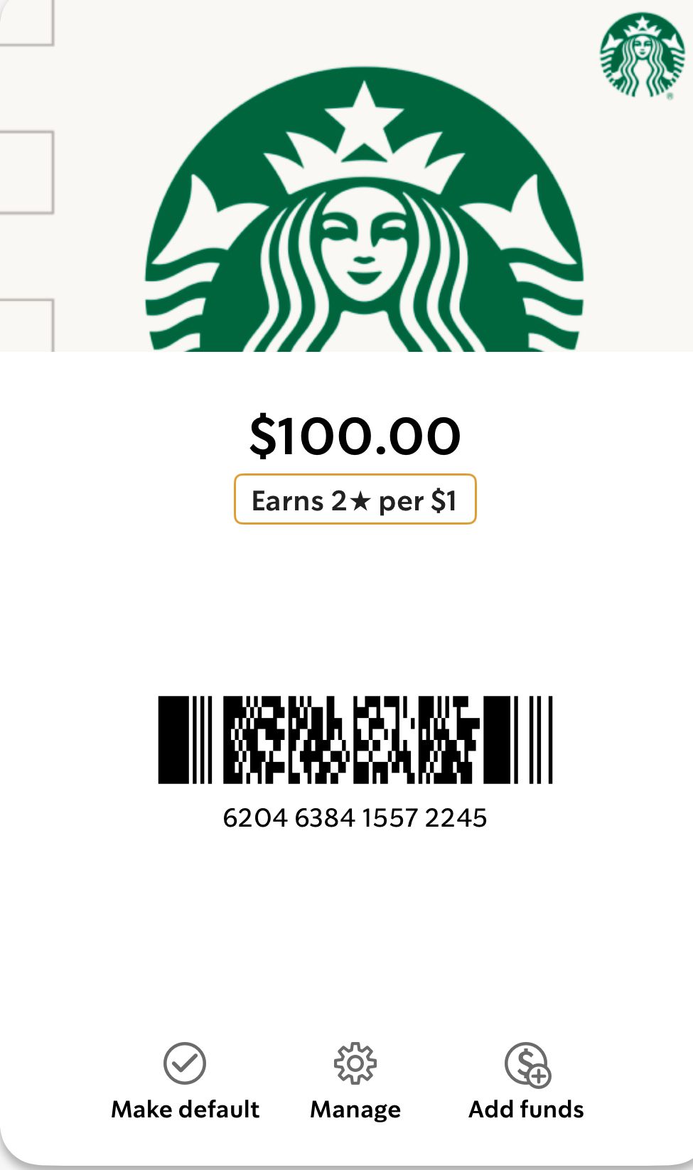 Simply scan the barcode below at any Starbucks location, or enter the gift card number online when making a purchase.